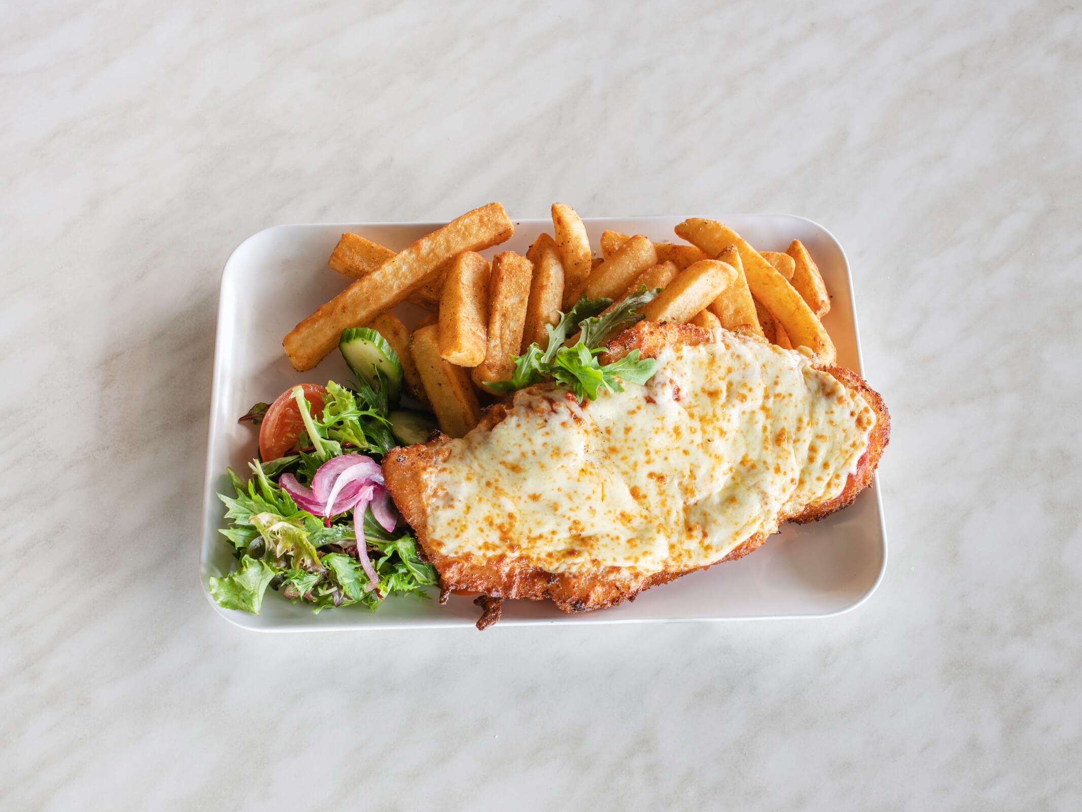 Crumbed chicken breast topped with Napoli sauce, Virginia ham, pineapple & mozzarella with chips and salad0